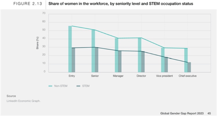 직급이 높아질수록 여성 비율은 감소하며, STEM 분야에서 그 하락 폭이 더욱 크다.